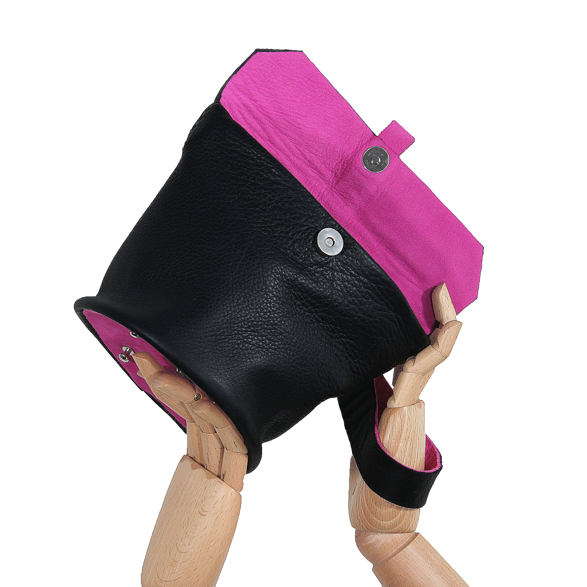SMALL BUCKET BAG IN BLACK AND PINK LEATHER.