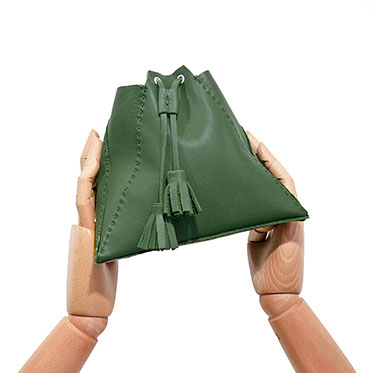 PYRAMIDAL BUCKET BAG IN OLIVE GREEN CALF-LEATHER.